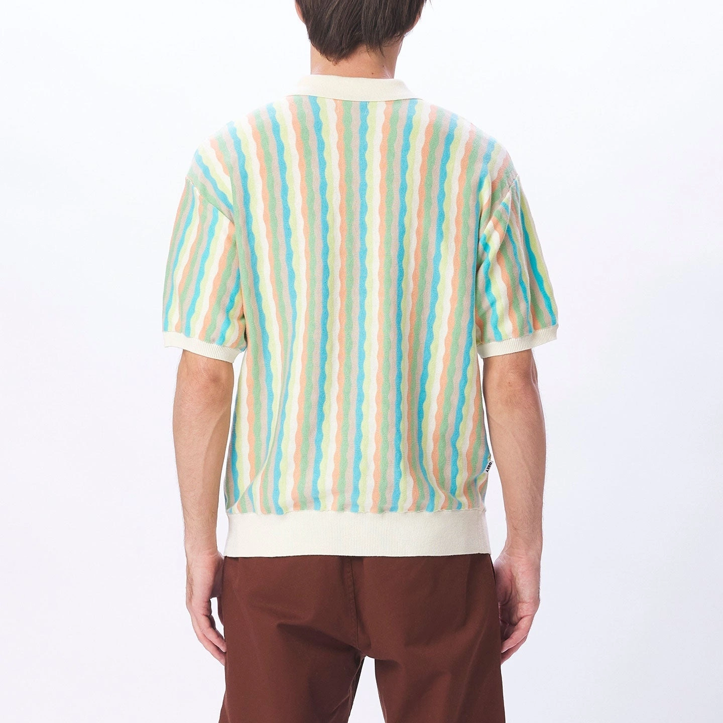 Collared short sleeve sweater featuring a stripe texture.